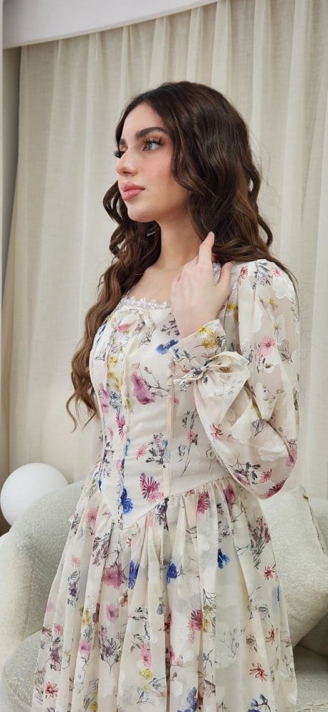 وصف المنتج: فستان شيفون مورد بناتي ناعم مورد باكمام مزين بازرار من الصدر مصنوع من قماش الشيفون الأصلي
