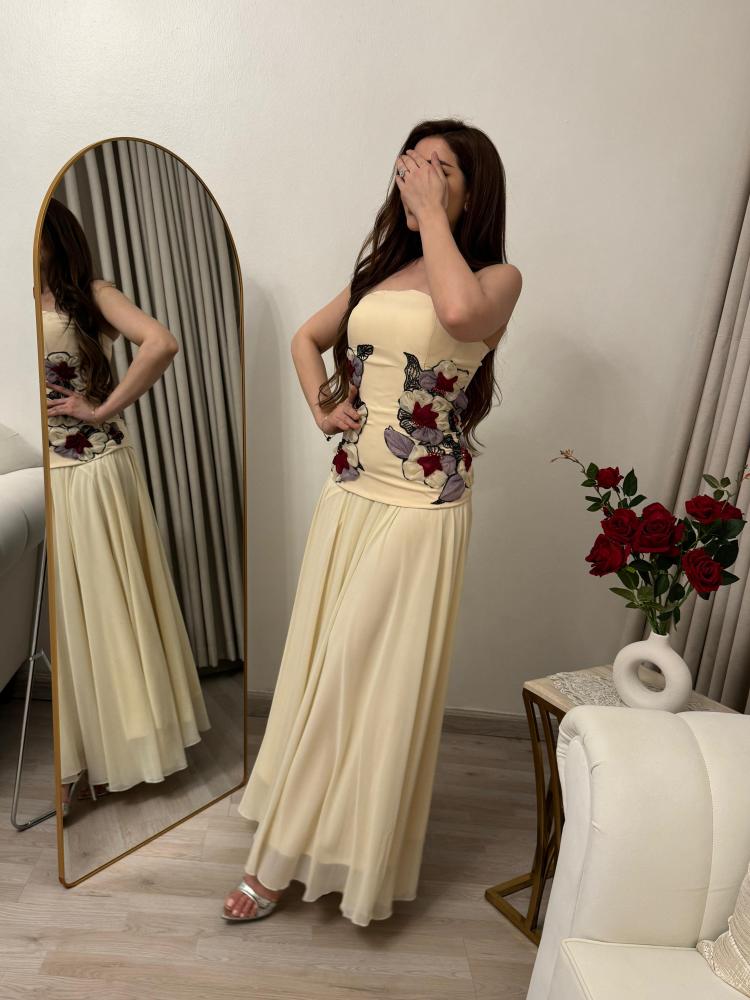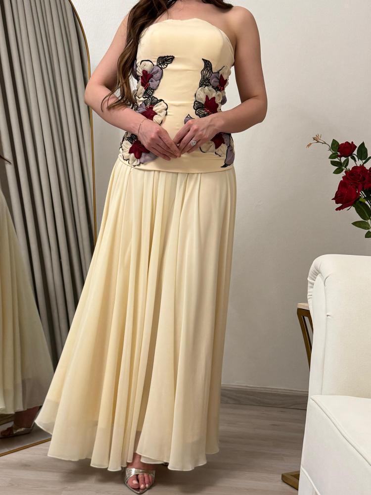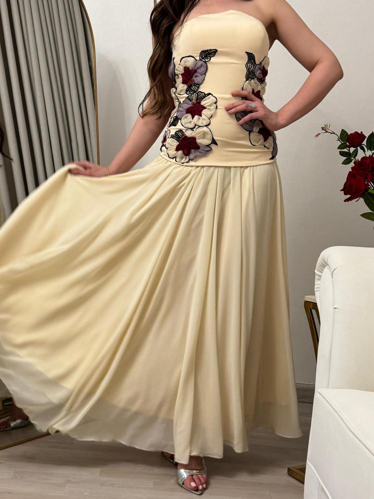 فستان طويل ناعم يمنحك إحساسا بالراحة والأناقة في آن واحد مع تطريز ورود بنفسجية تضفي لمسة رومانسية