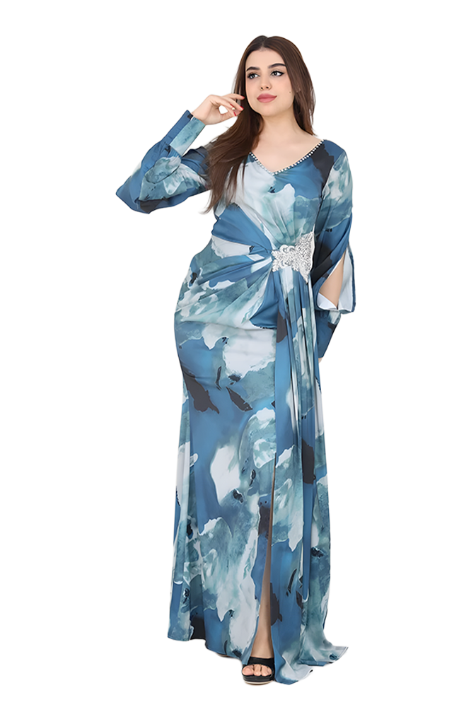 - يأتي باكمام طويله واسعه ومفتوحه من الجنب مما تضيف لمسه من الاناقه و التميز الى الفستان